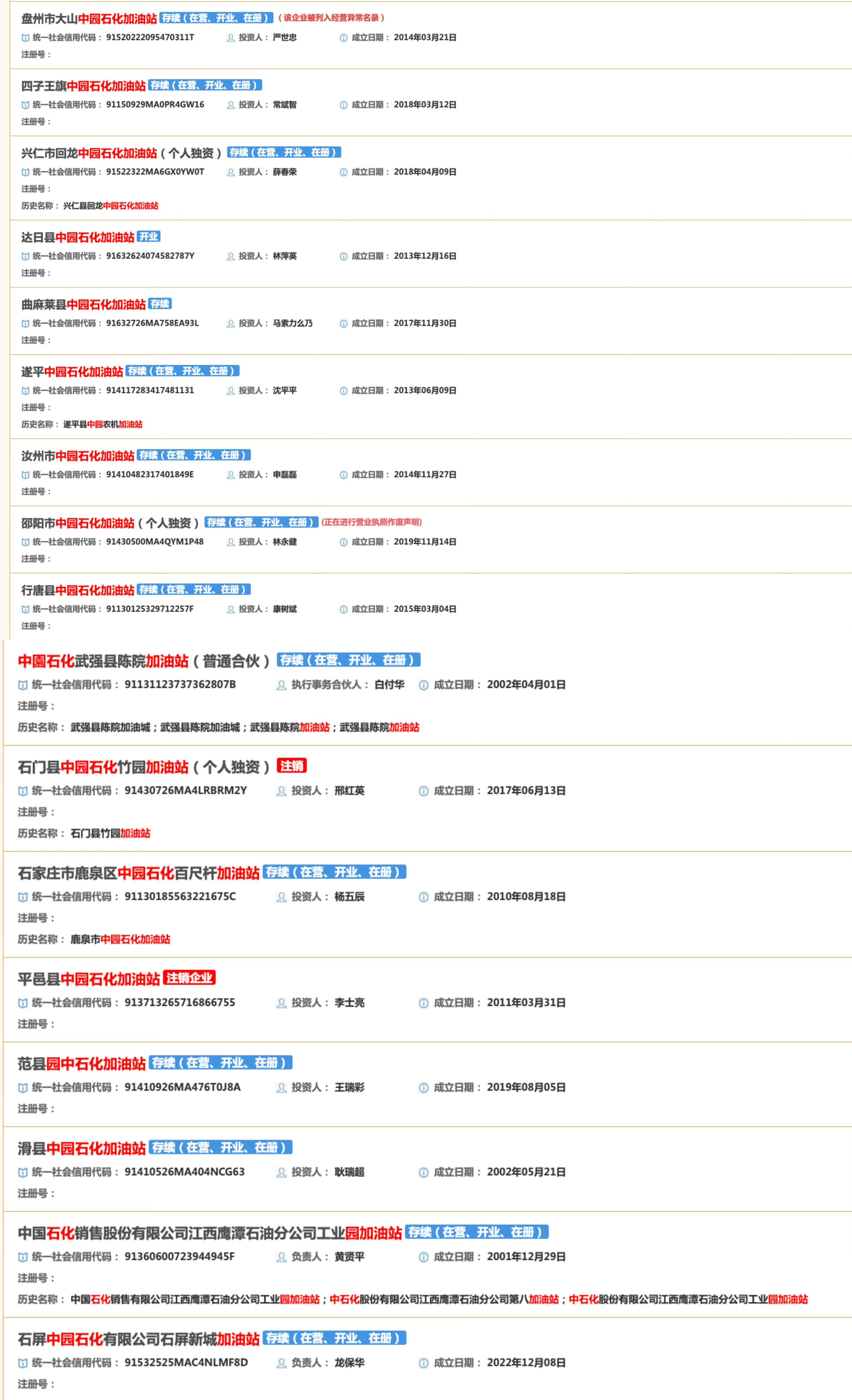 图自邦家企业疑用疑息公示体系 记者盘查邦家企业疑用疑息公示体系创造,今朝,尔邦借生存没有少企业称呼带有“中园石化”的添油站,包含:盘州市年夜山中园石化添油站、4子王旗中园石化添油站、兴仁市归龙中园石化添油站(小我私家独资)、达日县中园石化添油站、直麻莱县中园石化添油站等,且那些添油站广泛为小我私家独资企业。 另外,另有多个企业称号带有“中园石化”的添油站已刊出。(完)